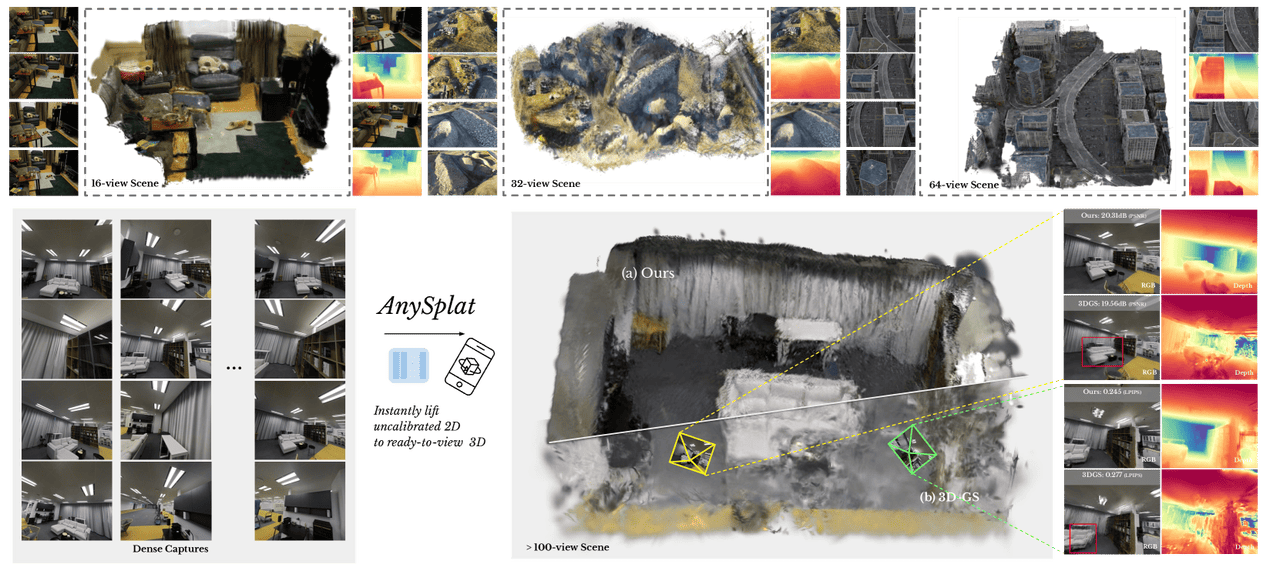 In this work, we introduce AnySplat, a feed-forward 3D reconstruction model that integrates a lightweight rendering head with our geometry-consistency enhancement, augmented by a self-supervised rendering proxy and knowledge distillation. We view this as a novel way to fully unlock the potential of 3D foundation models and elevate their scalability to a broader scope. Our experiments demonstrate AnySplat’s robust and competitive results on both sparse and dense multiview reconstruction and rendering benchmarks using unconstrained, uncalibrated inputs. Additionally, the model training remains efficient, requiring minimal time and compute, enabling feed-forward 3D Gaussian Splatting reconstructions and high-fidelity renderings in just seconds at inference time. We expect this low-latency pipeline to open new possibilities for future interactive and real-time 3D applications.Despite its improvements, AnySplat still observe artifacts in challenging regions, such as skies, specular highlights, and thin structures; its reconstruction-based rendering loss may be less stable under dynamic scenes or varying illumination, and the compute–resolution trade-off (i.e., number of Gaussians scaling alongside input and voxel resolution) can slow performance when handling very high resolution or large numbers of views. Future work should incorporate more diverse real‑world captures and high‑quality synthetic datasets, featuring varied camera trajectories and scene complexities from object‑centric to unbounded environments. On the technical side, enhancing patch‑size flexibility, improving robustness to repetitive texture patterns, and streamlining the scaling to thousands of high‑resolution inputs, especially paired with rapid advances in mobile capture technology, offer particularly promising directions.