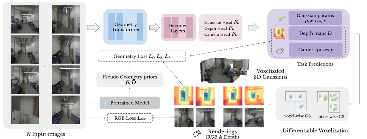 - Efficient self-supervised knowledge distillation. We distill geometry priors from a pretrained VGGT model via a novel, end-to-end training pipeline, without any 3D annotations, unlocking high-fidelity rendering and enhanced multi-view consistency in under one day on 8–16 GPUs.