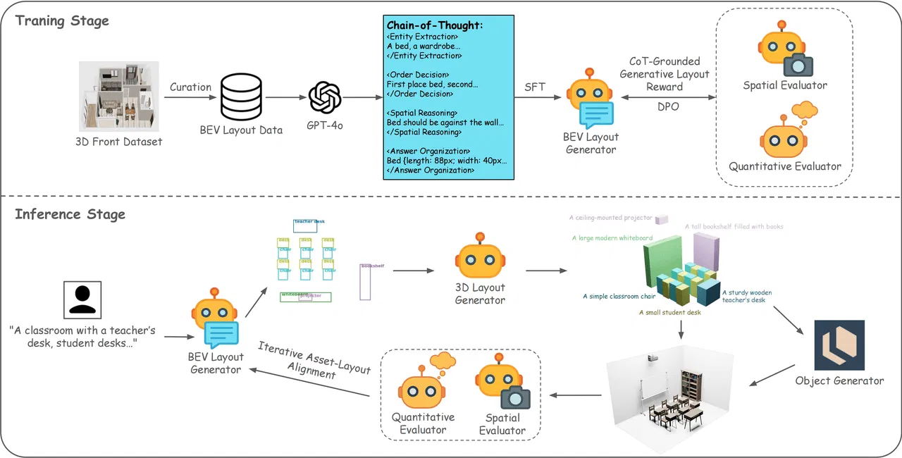 Training Stage: BEV Layout Generator is first fine-tuned on BEV layouts curated from the 3D-Front dataset, guided by CoT annotations generated by GPT-4o. Subsequently, it is further optimized through DPO, leveraging CoT-Grounded Generative Layout Reward derived from Spatial Evaluator (VLM) and Quantitative Evaluator (reasoning LLM).Inference Stage: Given a text prompt, BEV Layout Generator produces a 2D layout, which is then lifted to a 3D layout by 3D Layout Generator. Iterative Asset-Layout Alignment refines the 3D scene by using the Spatial and Quantitative Evaluators to provide feedback to the layout generators, ensuring consistency between the layout and generated 3D assets from an object generator.